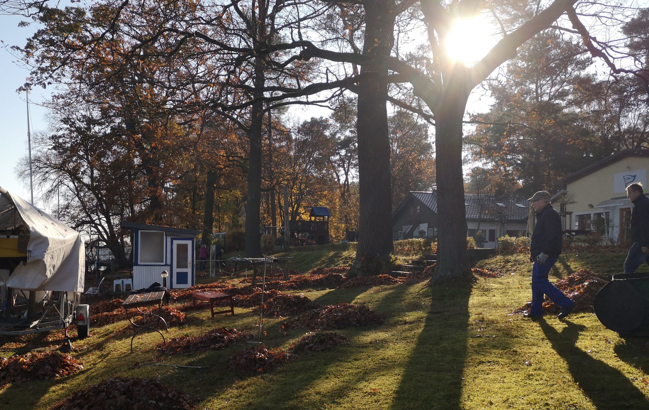 Ein letztes Mal in diesem Jahr lud Olaf zum fröhlichen Stelldichein mit Harke, Laubsack und sonstigen nützlichen Gerätschaften ein, um sich der Berge von Eichen- und Ahornlaub auf den Dächern und Rasenflächen zu entledigen. Wer unter der Woche einen leichten Bewegungsmangel verspürte, erhielt nun ausreichend Gelegenheit, an frischer Luft und bei schönstem Wetter seinen Kreislauf in Schwung zu bringen. Gesagt, getan. Um 9:30 Uhr schwirrte die Mitgliedschaft nach einer kurzen Ansprache von Olaf in alle Winkel des Vereinsgeländes aus und war bis zum Mittag um 12:00 Uhr nicht mehr zu bremsen.