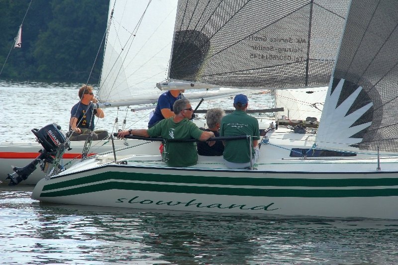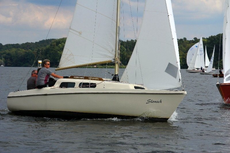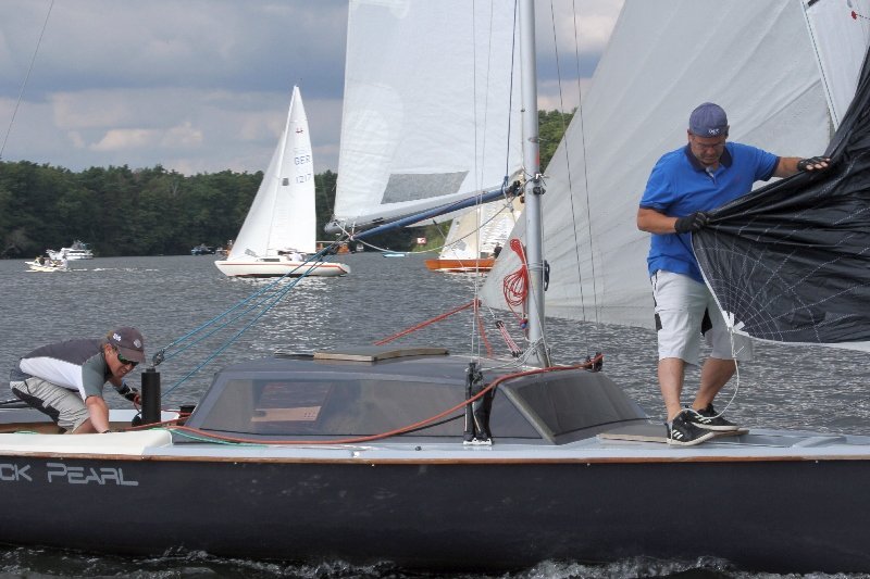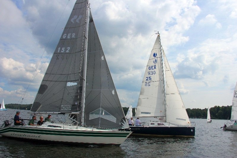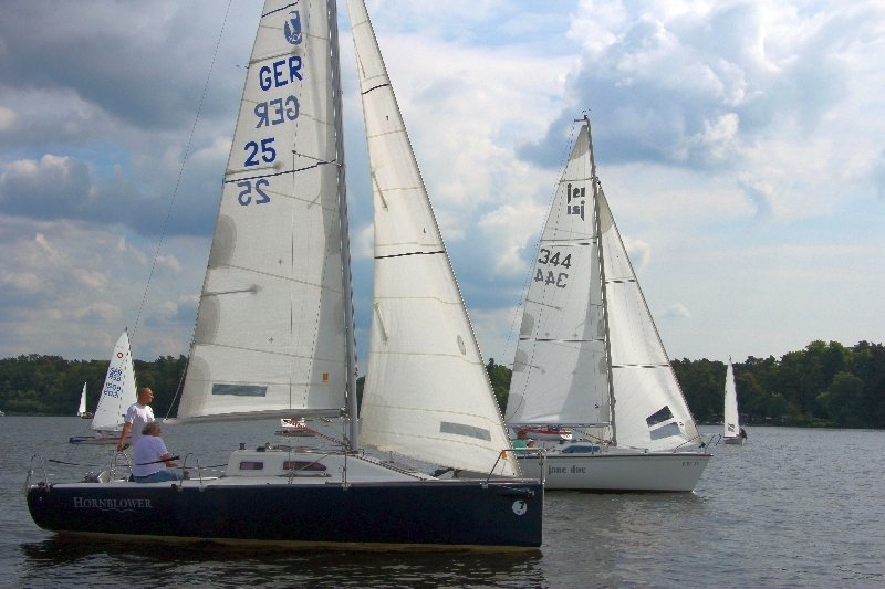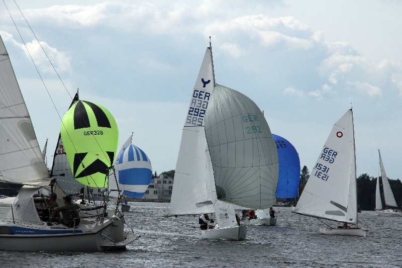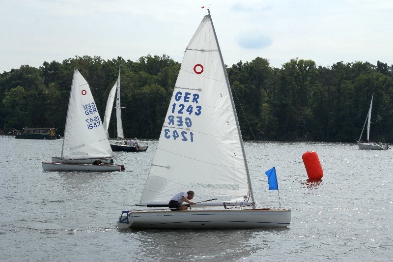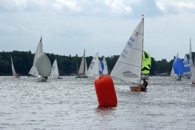 Um 1100 begann die Startprozedur auf und vor unserem Kopfsteg. Wie auf einer überdimensionalen Hühnerstande fanden sich nur eine Hand voll Zuschauer ein und folgten den Geschehnissen des Nudeltopfes. Denn die Regattabahn erstreckte sich angesichts des nur sehr leichten Windes aus Ost zwischen dem VSW, der Großen Krampe und den Reusen kurz vor der Badewiese Karolinenhof.