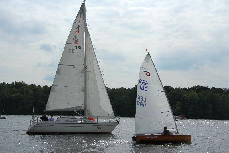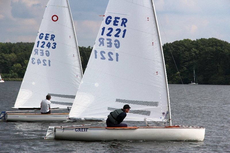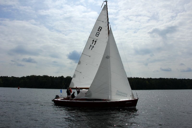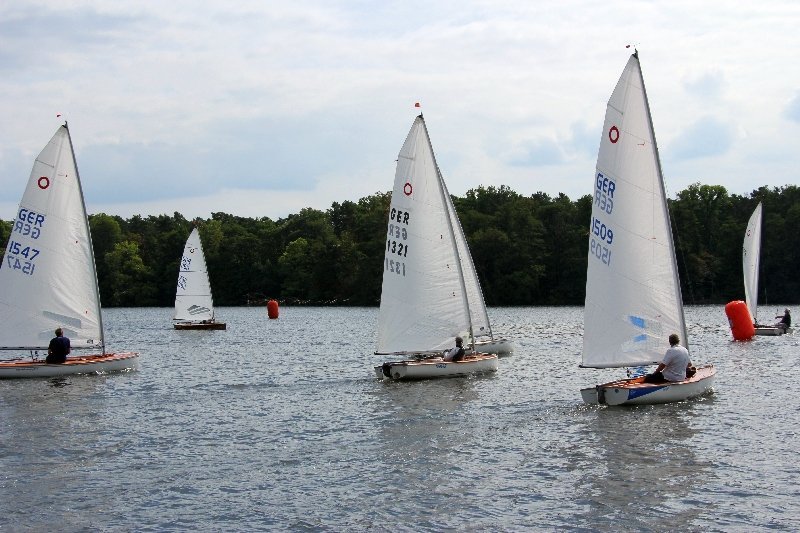 Um 1100 begann die Startprozedur auf und vor unserem Kopfsteg. Wie auf einer überdimensionalen Hühnerstande fanden sich nur eine Hand voll Zuschauer ein und folgten den Geschehnissen des Nudeltopfes. Denn die Regattabahn erstreckte sich angesichts des nur sehr leichten Windes aus Ost zwischen dem VSW, der Großen Krampe und den Reusen kurz vor der Badewiese Karolinenhof.